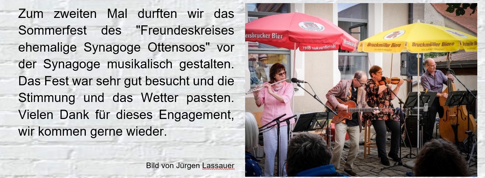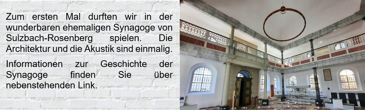 Nach 9 Jahren waren wir wieder in der wunderbaren Synagoge in Ermreuth. Das besondere hier ist die Akkustik und dass wir auf der "Bima" inmitten des Publikums stehen. So "eingekreist" von den Zuhörern ist es ein besonders intensives Erlebnis für uns Musiker. Aus dem reichlich gespendeten Applaus, konnten wir aber auch entnehmen, dass es uns gelungen ist, das Publikum auf die Reise "zum Garten Eden" mitzunehmen. Die Synagoge war ausverkauft, die Veranstalter mussten noch zusätzliche Stühle aufstellen, um möglichst keine Gäste abzuweisen. Vielen Dank Frau Dr. Nadler, für dieses schöne Erlebnis.