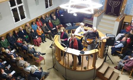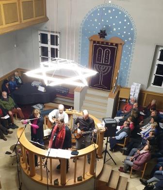 Erinnern für die Zukunft Zum Gedenken an die Reichspogromnacht am 9.11.1938 gestalteten wir mit Rainer Streng und Julia Seidel von der Literaturbühne Forchheim in der Synagoge Ernreuth einen sehr bewegenden Abend mit jiddischen Liedern und Texten zur Verfolgung der Juden und ihrem Überlebenswillen. Passagen aus dem Tagebuch der Anne Frank aber auch Texte, die zum Widerstand gegen Rassismus ermutigen sollen, gingen allen sehr nahe. Angesichts der aktuell aufgeheizten antijüdischen Stimmung erhielt die Synagoge vor dem Konzert eine Bombendrohung. Das Haus musste geräumt werden und wurde durchsucht. Gott sei Dank erwies sich die Drohung als Fake. Die Polizei beschützte uns bis zum Ende der Veranstaltung - vielen Dank dafür. |